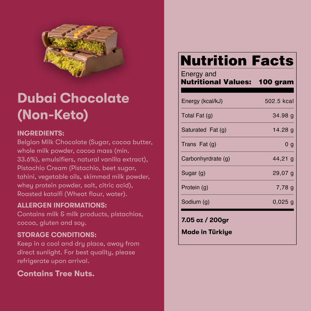 Take your taste buds on a first-class flight to Dubai! Smooth Belgian milk chocolate meets a dreamy pistachio cream filling, all wrapped up with a crunchy layer of roasted kataifi (think crispy golden pastry strands). Handmade in Turkey exclusively for Healthyish Bakery, this 200-gram bar is pure indulgence—no almond flour, no keto rules, just luxurious chocolate magic. Perfect for gifting, sharing… or keeping entirely to yourself.